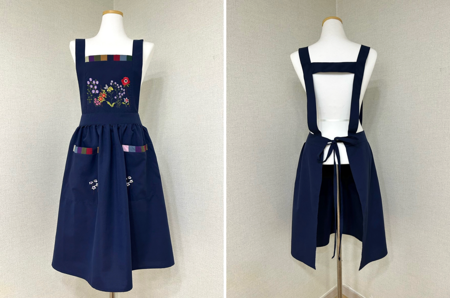 This apron features a refined navy cotton base accented with delicate floral embroidery inspired by traditional Korean aesthetics.