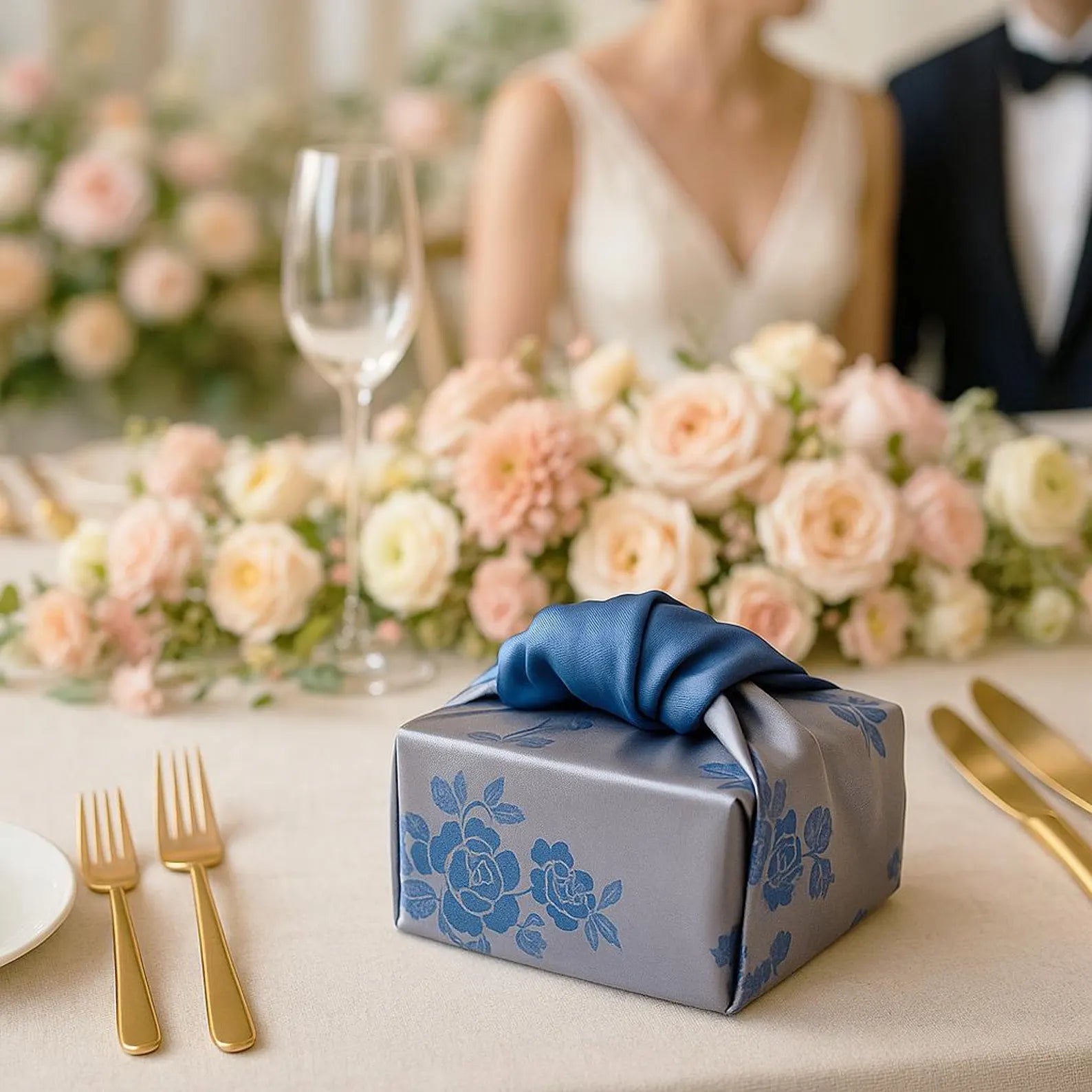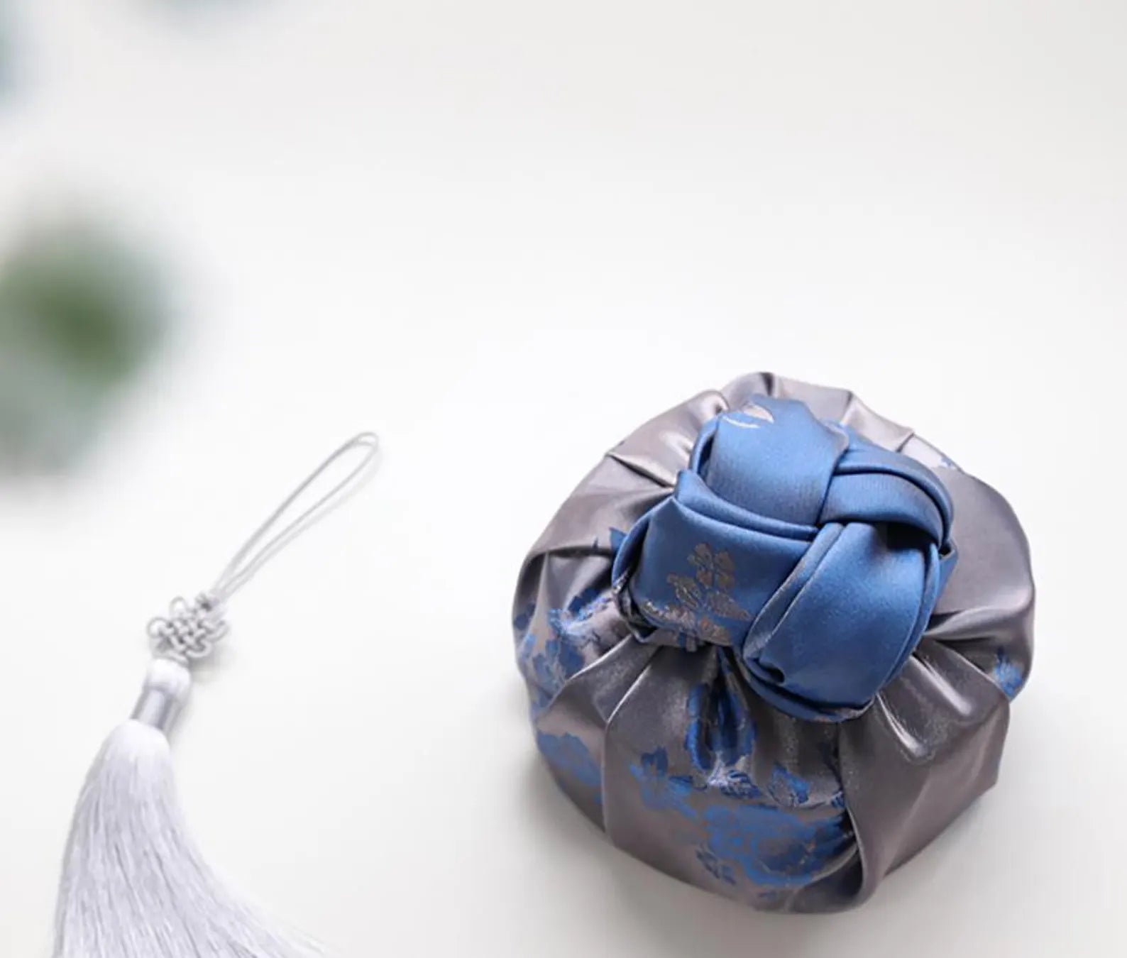 Silver & Blue Reversible Floral Bojagi Wrapping Cloth – Korean Satin Gift Wrap for Corporate Gifts, Wedding, or Event Packaging