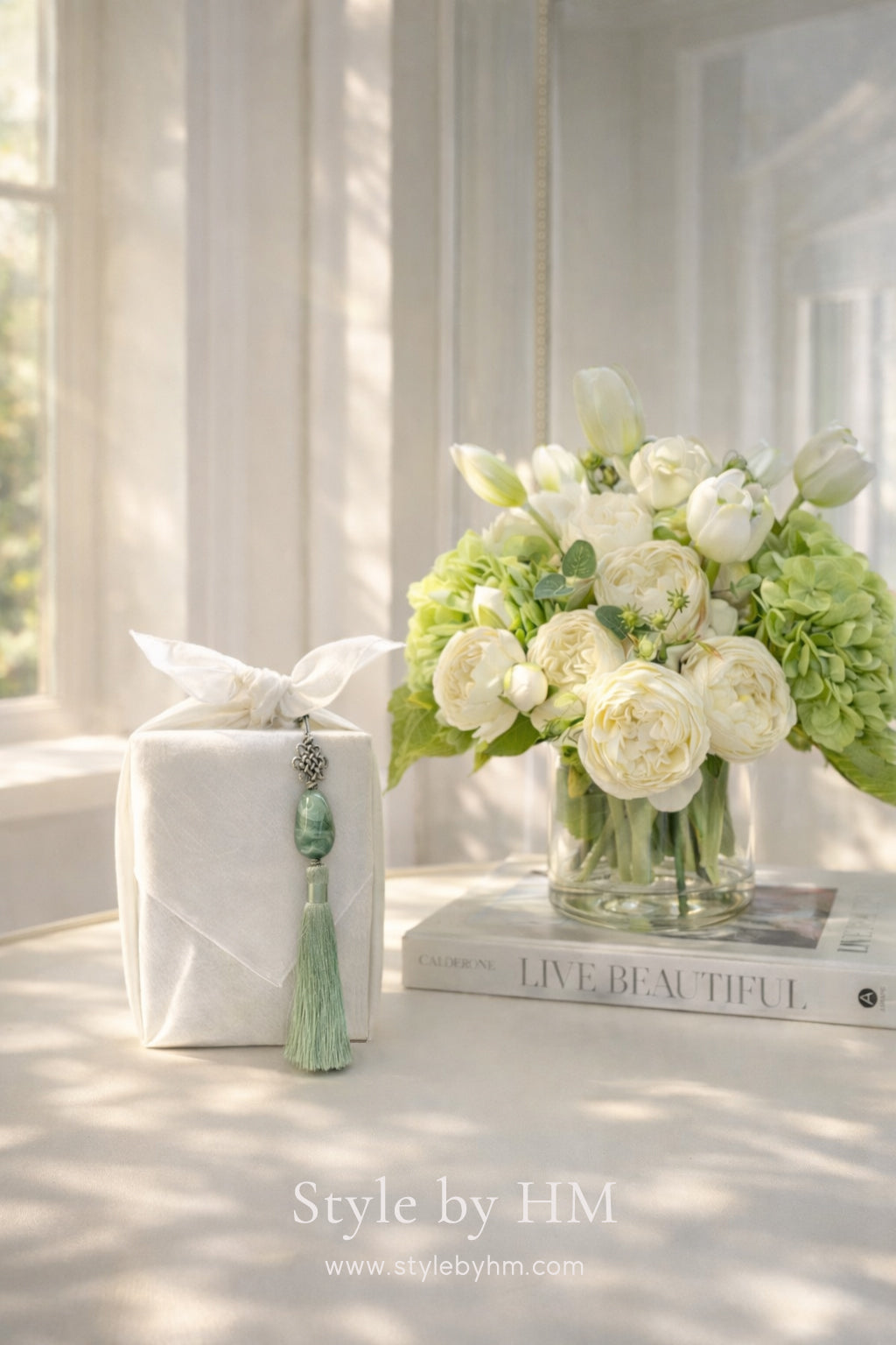 Elevate your gifting with our crisp white wrapping cloth, beautifully paired with a handcrafted norigae charm.