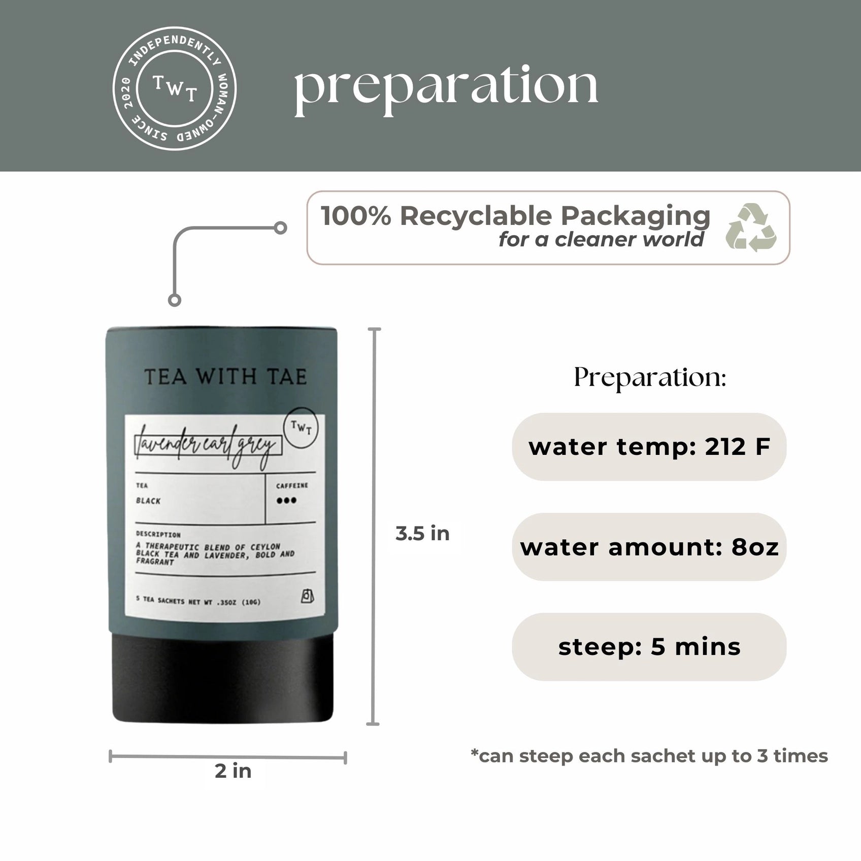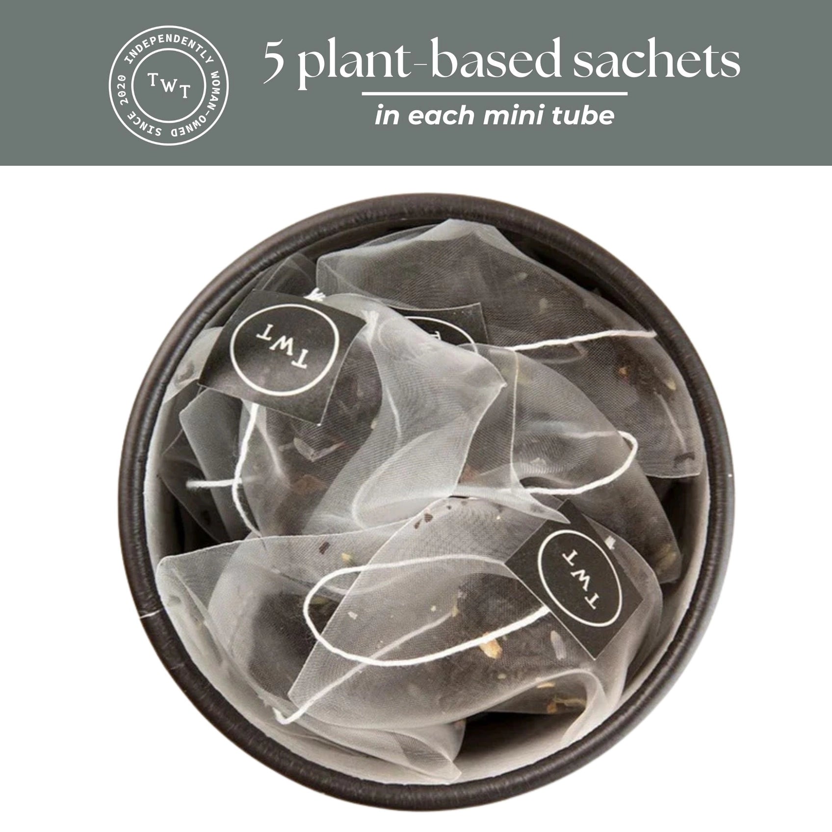 Inside, you’ll find 5 eco-friendly tea pyramid sachets that are biodegradable and free of petroleum-based microplastics. Each sachet contains approximately 2–2.5 grams of whole-leaf tea and herbs, and most customers enjoy 2–3 steepings per bag.