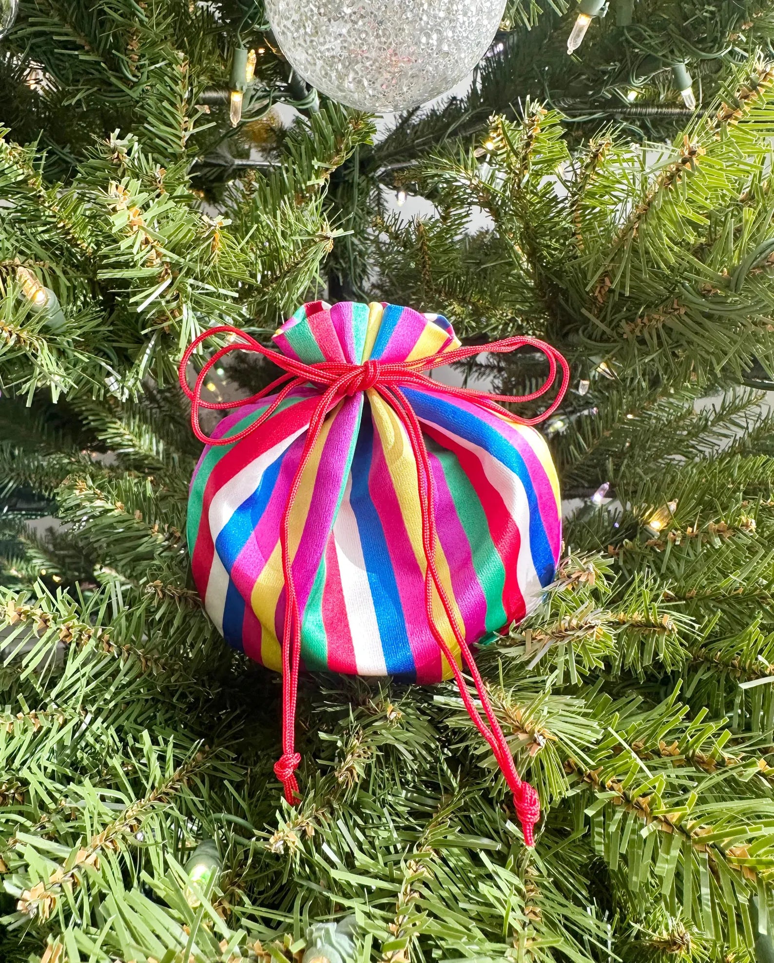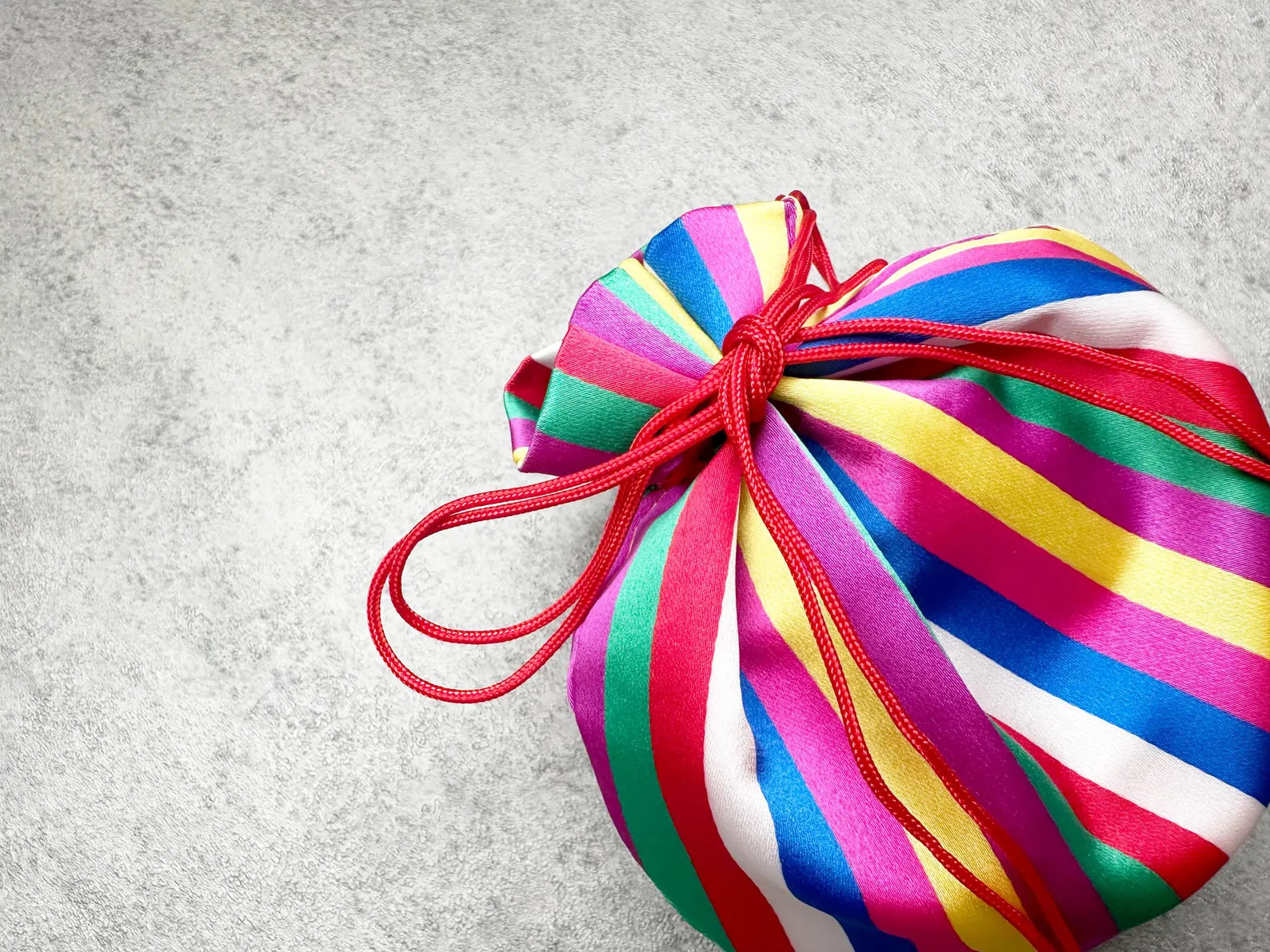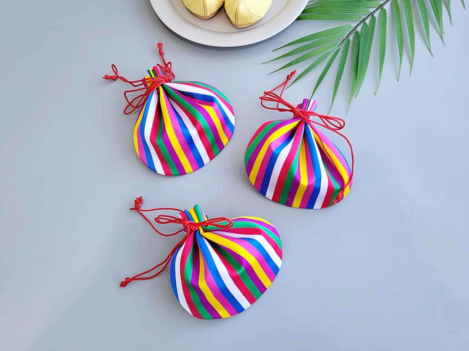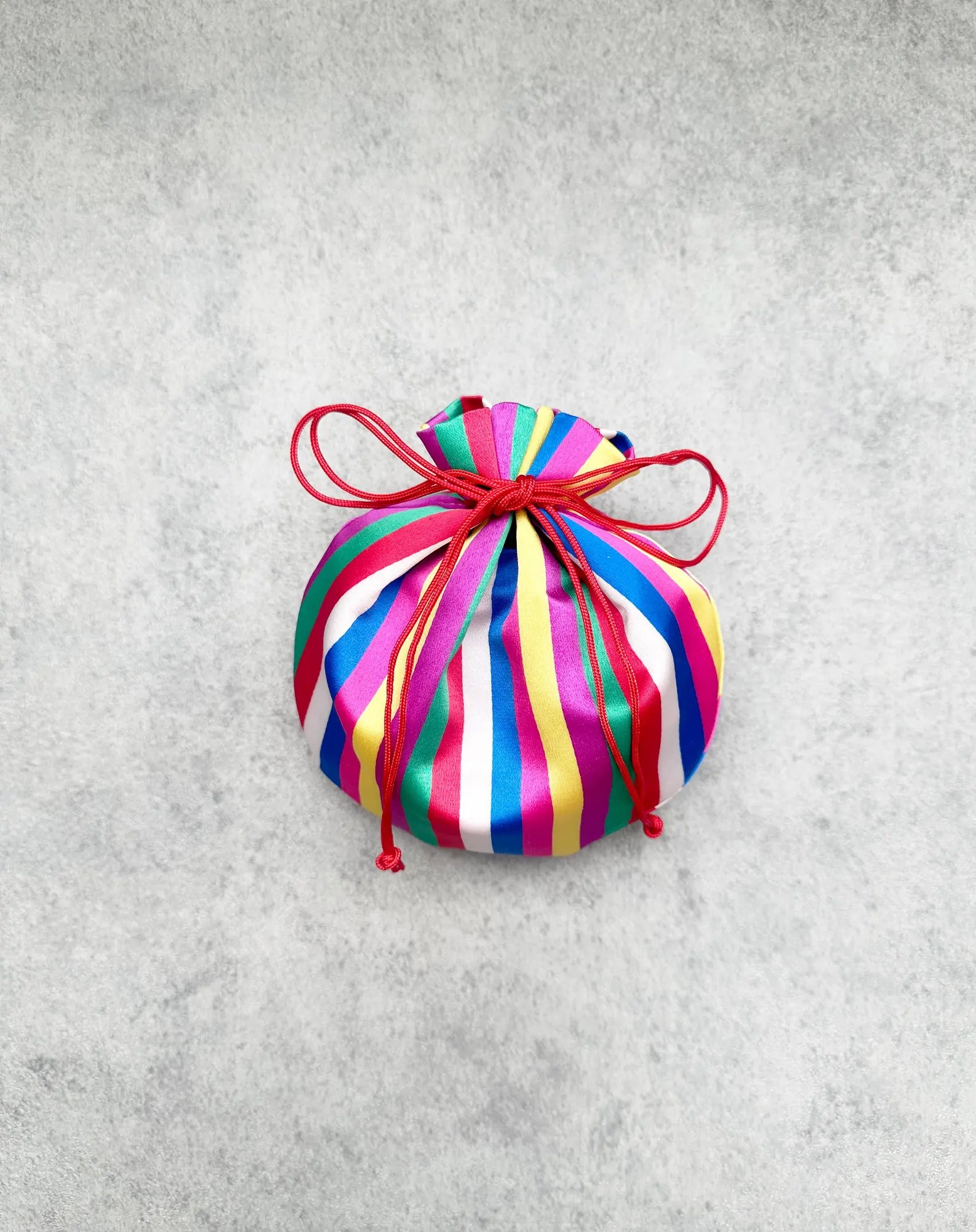 This traditional Korean bokjumeoni pouch is crafted with high-quality yangdan brocade in classic saekdong (rainbow stripe) colors.